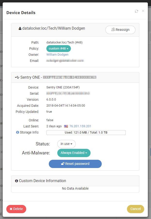 Neu gestaltet präsentiert sich in der SafeConsole 5.3.2 die Laufwerks- und Benutzeransicht, die sich als Pop-up Fenster öffnet. Alle wesentlichen Details zum jeweiligen USB-Laufwerk und seinem Benutzer sind auf einen Blick einsehbar. Auch wichtige Funktionen wie das Zurücksetzen des Passworts sind über eigene Schaltflächen direkt aus der Laufwerksansicht heraus erreichbar, ohne erst in andere Menüs wechseln zu müssen. Die Benutzerverwaltung wird darüber hinaus durch eine automatische Active-Directory-Synchronisation erleichtert. Anwender, die im Verzeichnisdienst neu angelegt werden, werden in der On-Premises-Variante von SafeConsole automatisch übernommen.
