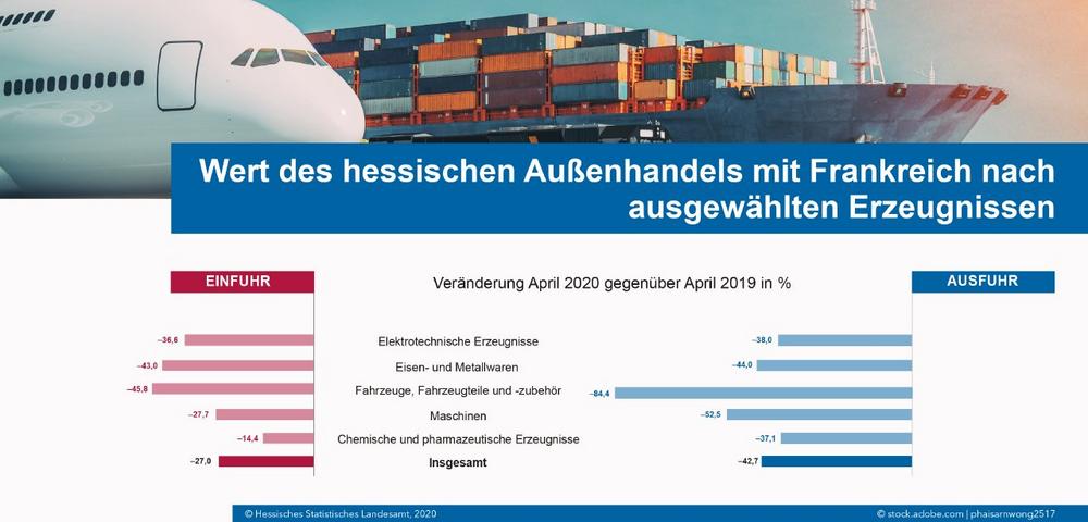 Nicht nur der hessische, auch der gesamtdeutsche Handel mit Frankreich litt unter der Corona-Krise: Die Exporte von Deutschland nach Frankreich nahmen im April 2020 gegenüber April 2019 um 48,3 Prozent ab, die Importe sanken um 37,3 Prozent.