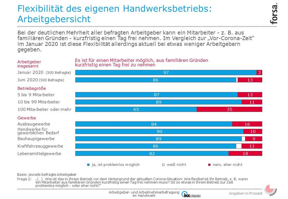 Die IKK classic hat handwerkliche Unternehmer und Beschäftigte nach ihren Erfahrungen mit betrieblicher Flexibilität befragt. Konkret wollte die Handwerker-Krankenkasse wissen: Ist es in den Betrieben in der Regel problemlos möglich, etwa aus familiären Gründen kurzfristig einen Tag frei zu nehmen? In der durch das forsa-Institut im Juni durchgeführten repräsentativen Befragung bejahten 86 Prozent der Arbeitgeber die Option des spontanen freien Tages, nur 13 Prozent schlossen sie aus. Bei einer analogen Erhebung im Januar hatten noch 97 Prozent der Arbeitgeber positiv geurteilt und nur 3 Prozent nicht. Offenbar hat die Erfahrung der dazwischenliegenden Corona-Zeit die neue Einschätzung beeinflusst.