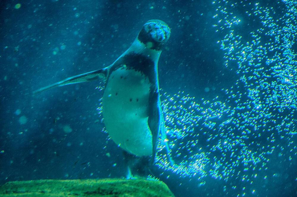 Die Gruppe der vom Aussterben bedrohten Humboldt-Pinguine zählt inzwischen 41 Tiere, eine echte Wohlfühlgröße für die Südamerikaner, die es gern gesellig mögen. In diesem Jahr bekamen die Pinguine, deren Heimat Peru und Nordchile ist, gleich acht Küken. Die Herausforderung für die Tierpfleger liegt darin, den Küken das eigenständige Fressen beizubringen. In der Natur versorgen die Elterntiere ihre Sprösslinge in den ersten 60 Tagen, danach kehren die Jungtiere nicht mehr in ihr Nest zurück. In menschlicher Obhut ist das anders, hier müssen sie erst einmal lernen, den Fisch richtig herum zu fressen, denn mit dem Kopf voran „flutscht“ er besser. Inzwischen sind alle acht Küken futterfest und tummeln sich mit dem Rest der Gruppe in der großzügigen Außenanlage – gut zu unterscheiden an ihrem grauen Federkleid.