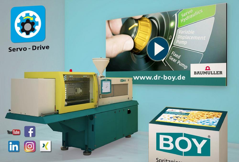 Auf dem virtuellen Messestand der Firma Baumüller – eines der langjährigen Partnerunternehmen von BOY – steht die BOY 60 E als Paradebeispiel für eine erfolgreiche Umsetzung der von Baumüller forcierten, effizienten Servohydraulik.
