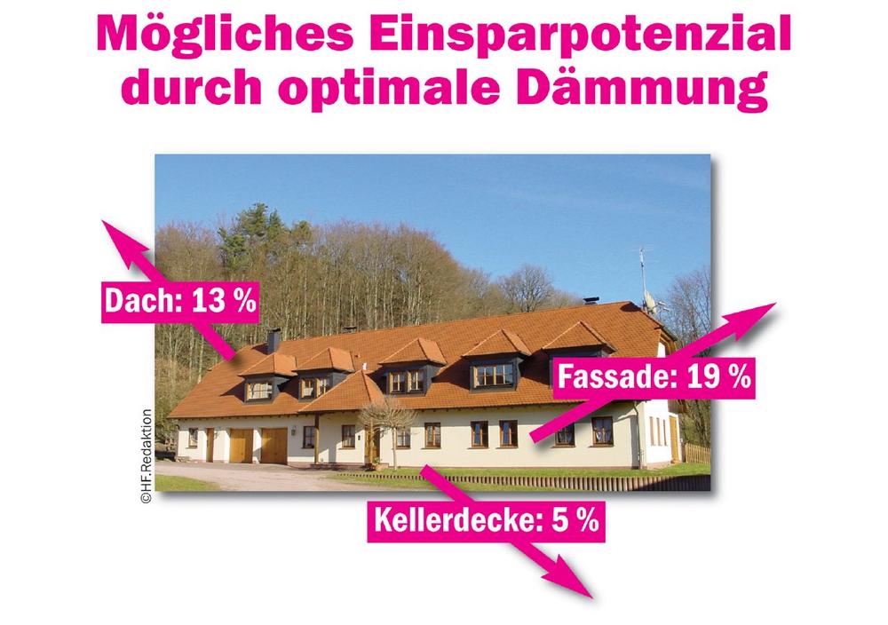So kann eine optimale Wärmedämmung der Fassade – z. B. durch vorgehängte hinterlüftete Fassadensysteme (VHF) – durchaus bis zu 19 % Energie einsparen. Werden zudem die Kellerdecke (5 %) und das Dach fachgerecht und zeitgemäß gedämmt (13 %), ergibt sich hier ein enormes Einsparpotenzial von bis zu 35 % und mehr. Damit kann nicht nur die Brennstoff-Preiserhöhung durch die höhere CO2-Bepreisung amortisiert werden. Bei fachgerecht ausgeführten Dämm-Maßnahmen ist trotz steigender Brennstoff-Kosten insgesamt eine Senkung der jährlichen Heizkosten durchaus möglich.