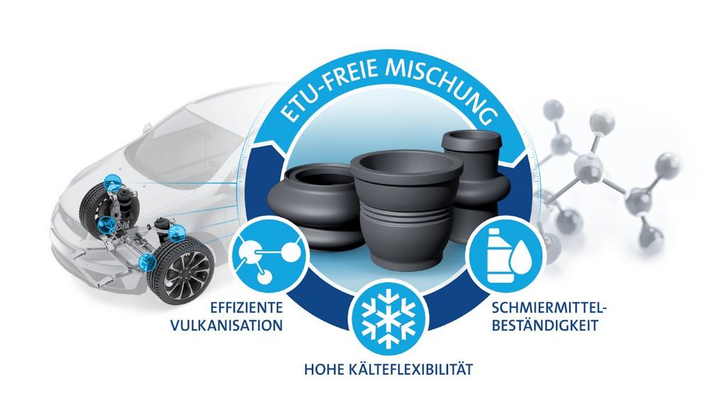 Freudenberg Sealing Technologies hat deshalb neue Elastomermischungen entwickelt, die bei der Herstellung von Produkten aus Chloropren-Kautschuk ohne Ethylenthioharnstoff als Beschleuniger auskommen. Eine der bereits erfolgreichen Anwendungen ETU-freier Produkte des Unternehmens im Bereich Automotive sind Dichtungsbälge für Gelenkabdichtungen bei Spurstangen, Lenkern und Querlenkern. Sie schützen die bewegten Teile vor äußeren Einflüssen und dem Austritt von Schmierstoffen. Freudenberg Sealing Technologies ist bei der Entwicklung neuer, ETU-freier Elastomermischungen einer der Vorreiter und gilt aktuell als Benchmark in diesem Bereich.