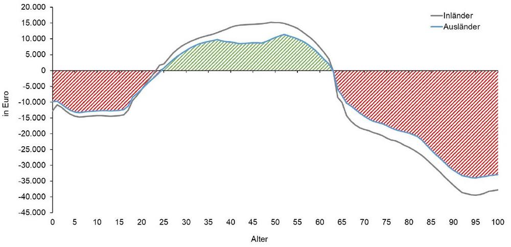 Zur Ermittlung der fiskalischen Bilanz der Einwanderung wurden für zukünftige Migrantinnen und Migranten die heutigen durchschnittlichen Pro-Kopf-Zahlungen der in Deutschland lebenden Ausländerinnen und Ausländer verwendet (vgl. Abb. 1). „Die unterstellte Integrationsdauer von sechs Jahren führt in diesem Szenario zu geringeren Nettozahlungen der zukünftigen Migrantinnen und Migranten als die der einheimischen Bevölkerung“, betont Prof. Dr. Bernd Raffelhüschen, Vorstandsmitglied der Stiftung Marktwirtschaft. Dies führe zu einem deutlichen Anstieg der Nachhaltigkeitslücke von 447,8 auf 497,1 Prozent des BIP. In einem hypothetischen Szenario ohne künftige Migrationsströme läge die Nachhaltigkeitslücke dagegen mit 347,4 Prozent des BIP um 149,7 Prozentpunkte niedriger. „Auch die fiskalische Bilanz zukünftiger Zuwanderung ist somit negativ und beträgt bei den angenommenen 293.000 Zuwanderern pro Jahr knapp das Anderthalbfache der aktuellen jährlichen Wirtschaftsleistung“, so der Ökonom.