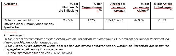 Die Anzahl der Aktien, für die persönlich oder durch Bevollmächtigte gestimmt wurde, betrug 1.341.825.415, was 47,40 % der insgesamt 2.830.567.264 ausgegebenen Stammaktien von Sibanye-Stillwater entspricht. Der auf der Hauptversammlung vorgeschlagene Beschluss und der Prozentsatz der Aktien, die für und gegen den Beschluss gestimmt haben, sowie die Aktien, die sich der Stimme enthalten haben, sind nachstehend aufgeführt: Tabelle