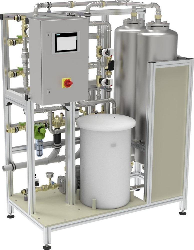 Der Reinigungsvorgang selbst ist so einfach wie genial. Das Kreislaufwasser durchströmt die verschiedenen Schichten des Filtrationsmoduls, wodurch es gereinigt wird. Beim anschließenden Rückspülen werden die einzelnen Filterschichten gespült und gleichzeitig wieder aufgelockert, während die zurückgehaltenen Partikel in den Abwasserkanal fließen. Im Anschluss daran erfüllt das Enthärtungsmodul seine Aufgabe: Es befreit das filtrierte Kreislaufwasser nach dem Ionenaustauschprinzip von Calcium und Magnesium und verhindert dadurch zuverlässig Kalkablagerungen.
