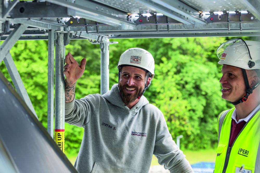 Bereits frühzeitig machten sich Stefan Sentesch und sein Gerüstbauteam mit dem PERI UP System vertraut: Im Weißenhorner PERI Fortbildungszentrum wurden die entsprechenden Grundlagen in Theorie und Praxis vermittelt. Zudem begleitete der PERI Fachberater die Gerüstmontage in Siegsdorf, um das Team bei deren Erstanwendung kompetent vor Ort zu unterstützen. Trotz vorbereitender Gerüstplanung konnten Fragen bei der Umsetzung sofort geklärt und wertvolle Tipps vermittelt werden.