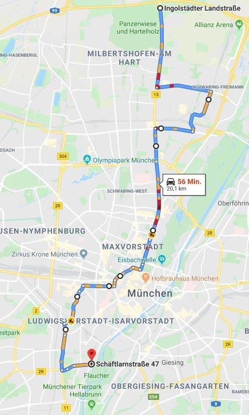 Was mit dem Auto eine knappe Stunde Fahrzeit wäre, dauert im Riesen-Konvoi ein Wochenende lang: Die 20 Kilometer lange Fahrt vom A99-Anschluss München-Neuherberg zur Schäftlarnstraße wird im Schritttempo absolviert und von der Polizei begleitet. Diese sperrt abschnittweise Kreuzungen bzw. Straßen. Um die Einschränkungen dennoch möglichst gering zu halten, pausiert der Konvoi am Samstag.