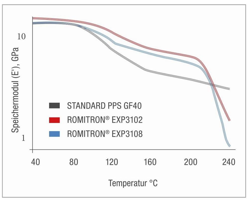 Um die oben erwähnte Leistungslücke zu schließen, hat ROMIRA die neuen ROMITRON® EXP3102 und EXP3108 Typen mit verbesserter thermischer Stabilität entwickelt. Bei diesen Typen handelt es sich um PPS GF40-Blends, die bei Temperaturen über 100 °C einen höheren Speichermodul als Standard-PPS GF40 aufweisen (siehe Testergebnisse im Diagramm). Der höhere Speichermodul beweist die Fähigkeit dieser Typen, ihre Eigenschaften auch bei hohen Temperaturen beizubehalten.