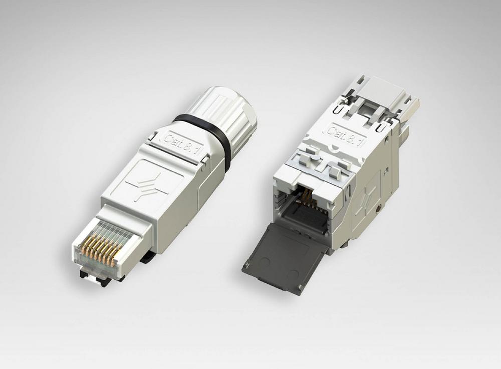 Der Steckverbinder MFP8 Cat. 8.1 verfügt ebenso über ein robustes Zinkdruckgehäuse sowie eine Kabelverschraubung passend für Kabeldurchmesser von 5.5-10.0 mm. Er kann ohne Spezialwerkzeug vor Ort an Installationskabel und Rangierkabel der Kategorie Cat.8.1/Cat.8.2 mit Kupferleiterquerschnitt AWG27/7 – 22/7 oder AWG26/1 – 22/1 angeschlossen werden und direkte Verbindungen zwischen entsprechenden Endgeräten herstellen. Genauso lassen sich damit Rangierschnüre nach Maß konfektionieren.