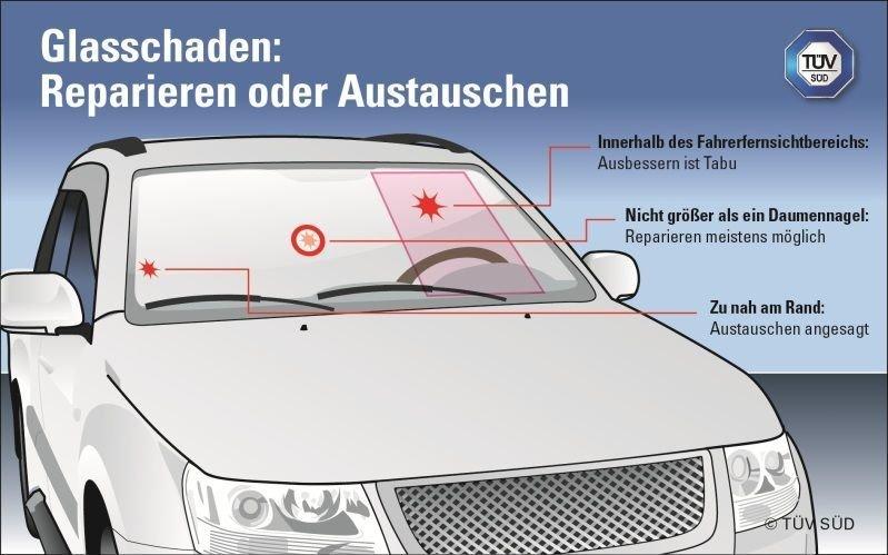 „Ein kompletter Austausch der Scheibe ist jedoch in den seltensten Fällen sofort nötig“, sagt Eberhard Lang von TÜV SÜD. Meist entsteht beim ersten Einschlag ins Verbundglas zunächst ein kleiner, sternförmiger Krater, der in der Regel repariert werden kann. Die Reparaturverfahren dafür sind auf sehr hohem Niveau und sicher. Zusätzlicher Vorteil: Solche Ausbesserungen schlagen in der Regel mit nicht mehr als 100 Euro zu Buche; Kosten, die von den meisten Versicherungen unter Verzicht auf die Selbstbeteiligung übernommen werden. Lang: „Die Reparatur von kleinen Schäden ist eine sichere Sache. Der Austausch der kompletten Scheibe dadurch immer seltener nötig.“