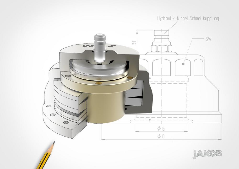Beim Spannen von Rotationsmessern in Fleischkuttern kommt es auf eine einfache Bedienung genauso wie auf maximale Betriebssicherheit an. Mit den hydromechanischen Federspannmuttern der Reihe HSM-VA von JAKOB Antriebstechnik wird genau dieses Bedürfnis gedeckt. Die Spannkraft der Spannmutter wird dabei durch ein Tellerfederpaket erzeugt, das beim Spann- und Lösevorgang hydraulisch vorgespannt wird. Diese innovative Bauart gewährleistet absolute Leckagesicherheit sowie eine Mindestspannkraft über einen großen Spannhubbereich. Die für den Lebensmittelbereich nicht unüblichen großen Temperaturschwankungen (Stichwort Kochkutter) oder Setzungen auf der Messerwelle können so problemlos egalisiert werden. Das Edelstahldesign macht die Federspannmutter HSM-VA dabei äußerst robust und pflegeleicht.