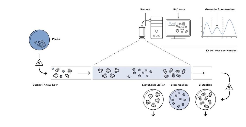 Beim Anwendungspaar „Stammzellenforschung und steriler Abfüllprozess“ galt es in beiden Fällen winzige Mengen präzise zu dosieren (Bild 2). Die Stammzellen müssen mit genau definierter Geschwindigkeit fließen, damit sie dem Durchflusskanal entnommen, identifiziert, gezählt und in Reagenzgläser gefüllt werden können. Lymphoide Zellen, Stammzellen und Blutzellen lassen sich bei diesem Verfahren erstmals voneinander trennen, ohne dabei die Beschaffenheit der Zellen unbeabsichtigt zu verändern. Die fluidische Systemlösung, die von Bürkert entwickelt wurde, konnte dazu entscheidend beitragen.