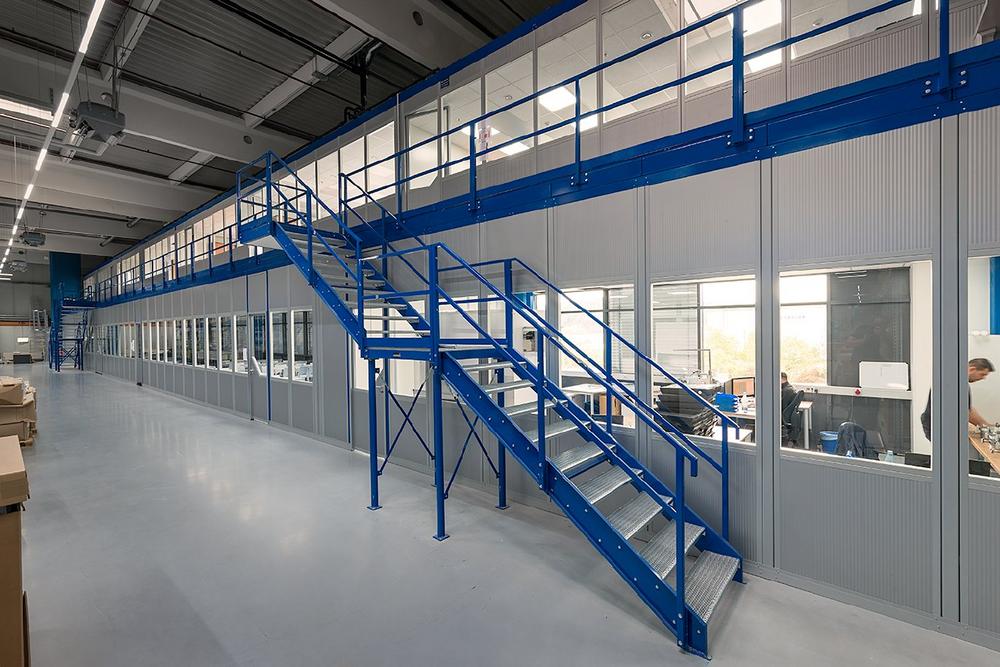 Der Hauptsitz in Würzburg verfügt über 20.000 m² Lager- bzw. Produktionsfläche und weitere 5.000 m² für Büros. Um auch innerhalb der Halle gesonderte Flächen für beispielsweise Büroräume, Aufenthalts- oder Werkstattbereiche in Produktionsnähe zu ermöglichen, errichtete KLEUSBERG mehrere Trennwandanlagen mit einer Gesamtlänge von ca. 70 m sowie Systemräume, die einer Fläche von 800 m² entsprechen. Die unterschiedlichen Aufstellungsmöglichkeiten des Systems TRENDLINE bieten eine optimale Flächenausnutzung. So wurde ein Hallenbüro mittels Stahlbaubühne aufgeständert und die Fläche unterhalb des Büros für einen weiteren Werkstattbereich nutzbar gemacht. An einer anderen Position schuf man neue Räume ohne von Staplern genutzte Fahrwege zu versperren, indem ein Hallenbüro im Obergeschoss auskragend ausgeführt wurde.