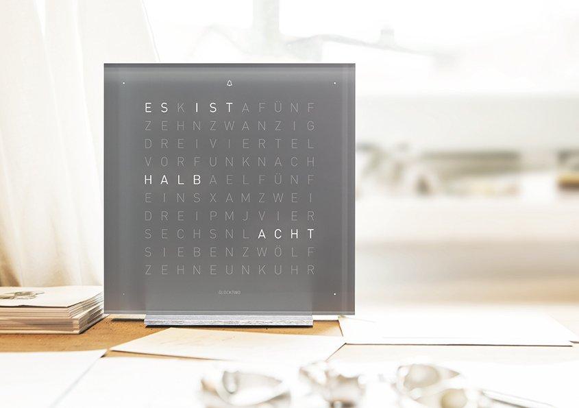 QLOCKTWO® zelebriert die Zeit auf besondere Weise. Die typografische Anzeige verbindet den Moment mit dem geschriebenen Wort und macht ihn zum Statement „ES IST HALB ACHT". Eine Matrix aus 110 scheinbar willkürlich angeordneten Schriftzeichen bildet die Grundlage. Die einzelnen Buchstaben werden durch Leuchtflächen zu Wörtern zusammengesetzt, die die Uhrzeit in Fünf-Minuten-Schritten beschreiben. 4 Leuchtpunkte in den Ecken sorgen für die minutengenaue Anzeige. Neben den Modellen QLOCKTWO® CLASSIC, QLOCKTWO® LARGE und QLOCKTWO® 180 (Wand- und Standuhr bzw. Wanduhr) umfasst das aktuelle Produktportfolio eine praktische Tischuhr mit Alarmfunktion, QLOCKTWO® TOUCH, sowie eine hochwertige Armbanduhr in zwei Größen, QLOCKTWO® W35 und QLOCKTWO® W39.