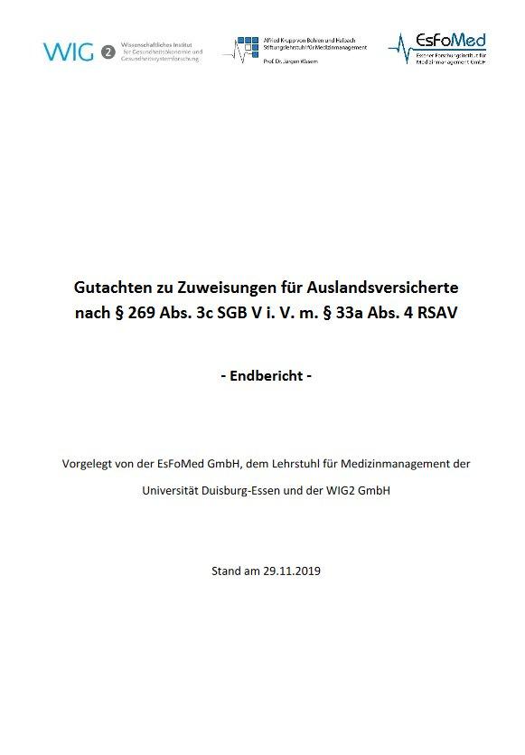 Das „Gutachten zu Zuweisungen für Auslandsversicherte nach § 269 Abs. 3c SGB V i. V. m. § 33a Abs. 4 RSAV“ kann unter folgendem Link eingesehen und heruntergeladen werden (PDF; 4 MB): https://www.bundesamtsozialesicherung.de/de/themen/risikostrukturausgleich/folgegutachten-ueber-die-verteilung-von-zuweisungen-an-krankenkassen-fuer-krankengeld-und-auslandsversicherte/