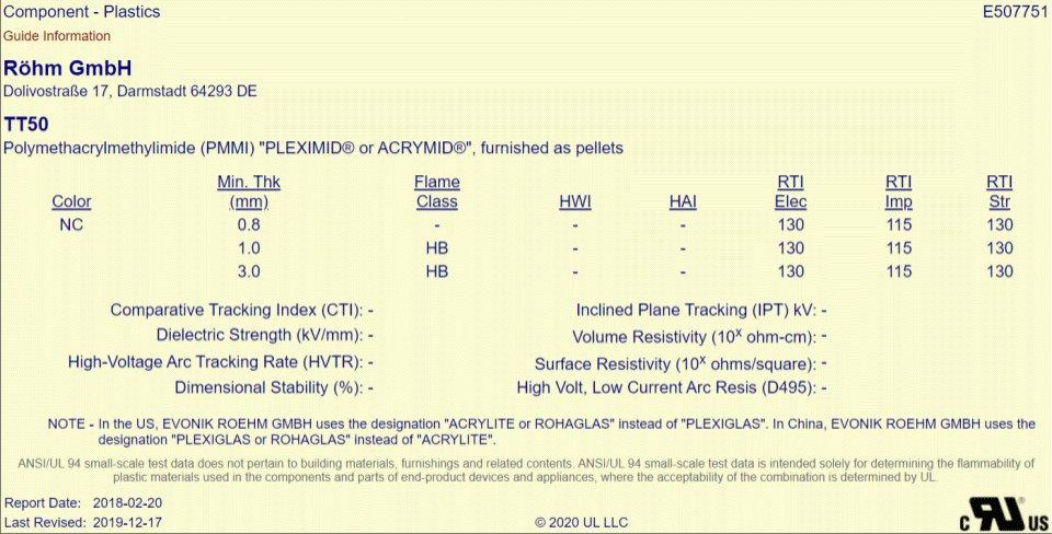 Die "Yellow Cards" von PLEXIMID®/ACRYMID® sind unter der file number E507751 für die Röhm GmbH bei Underwriters Laboratories (UL) gelistet.