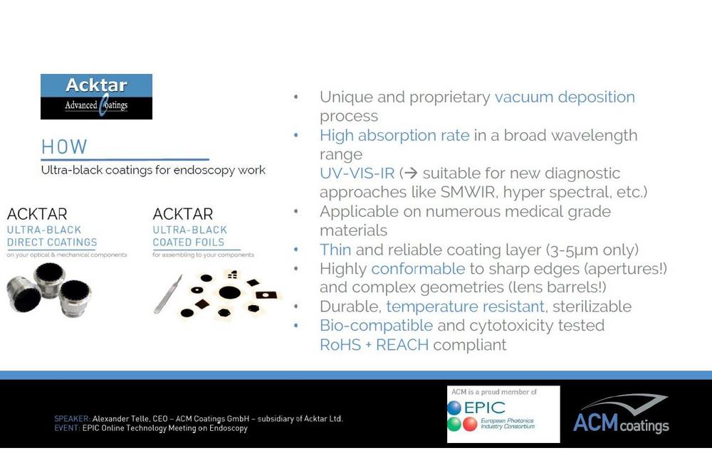 ACM Coatings GmbH ist das deutsche Tochterunternehmen der Acktar Ltd. (Israel) und produziert und vertreibt Acktars weltweit führende tiefschwarze Folien und Direktbeschichtungen in Deutschland und Europa. Die lichtabsorbierenden Eigenschaften der Acktar-Folien & Beschichtungen dienen der Optimierung optischer Systeme für vielfältige anspruchsvolle Anwendungen.