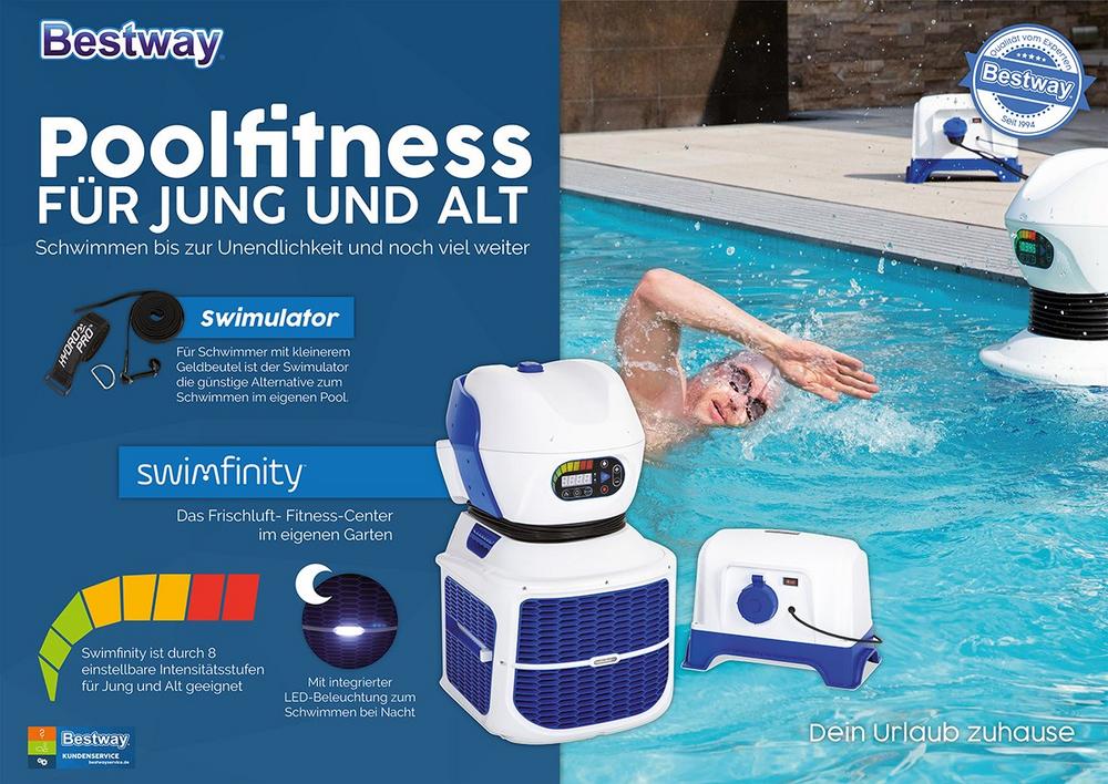 Das Frischluft-Fitnesscenter für den Garten – Sowohl für eingelassene Schwimmbecken als auch für Frame Pools ab einer Länge von 457 cm, sorgt die Gegenstromanlage Swimfinity mit unendlicher Schwimmfitness für das regelmäßige Sportprogramm ohne teure Eintrittspreise, lange Warteschlangen und ständig belegte Sonnenliegen.
