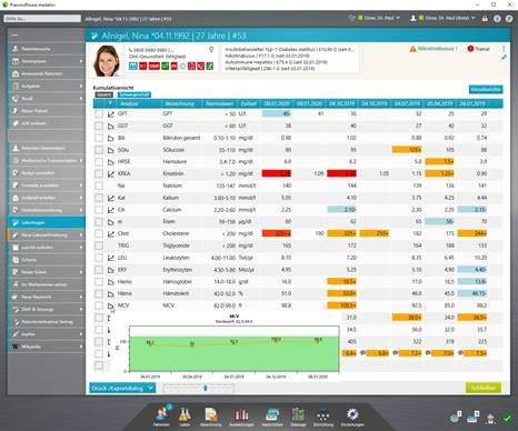 Manche Patienten müssen oft ihr Blut kontrollieren lassen. Da sammeln sich viele Laborwerte im System. Damit Ärzte dort den Überblick nicht verlieren, können sie nun die sichtbaren Spalten begrenzen. Sie entscheiden, wie viele Testergebnisse angezeigt werden. Eine Zoomfunktion dient der Skalierung der individuellen Ansicht. Sind Grenzwertüber- oder -unterschreitungen vorhanden, werden diese durch die Zeichen ++; +; -; –; ! sowie mittels Farbhinterlegungen hervorgehoben. Darüber hinaus sieht das Praxispersonal vor den einzelnen Zeilen ein kleines Trenddiagramm pro Laborwert, das anzeigt, wie sich ein Wert verändert hat. Wenn das Personal die Maus über den Pfeil bewegt, erscheint die grafische Anzeige des Werteverlaufs inklusive Datumsangabe.