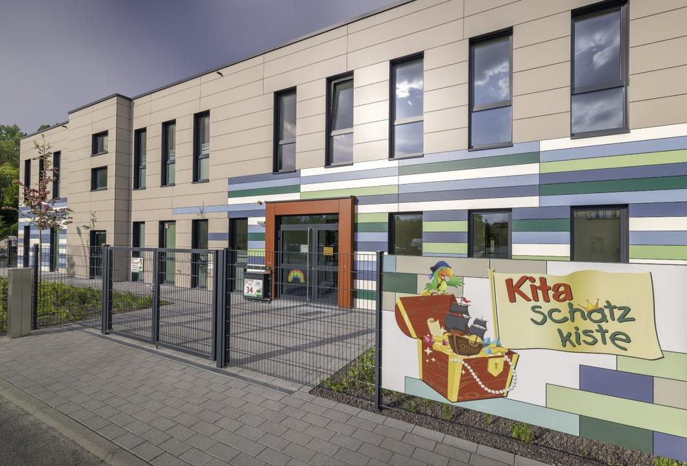 Als die Eltern ihre Kinder am 13. Februar 2020 zur offiziellen Einweihung begleiteten, führte sie ein gepflasterter Weg zum Haupteingang der „Schatzkiste“, die Wände in den Fluren waren bereits liebevoll bemalt, in den Räumen hatte jeder Wachsmalstift (noch) seinen Platz und die Scheren lagen für den ersten Schnitt bereit. Im Fachjargon: KLEUSBERG hat die Einrichtung „löffelfertig“ realisiert. Der Neubau bietet über 130 Kindern einen Betreuungsplatz. Gelebt wird hier ein teiloffenes Konzept – es gibt feste personenbezogene Strukturen innerhalb einer Gruppe. Die Räume hingegen sind nicht den Gruppen zugordnet, sondern werden entsprechend ihren Funktionen genutzt. Nach den Grundsätzen der elementaren Bildung werden Schwerpunkte wie Grundlagen der Mathematik & Naturwissenschaften, Musik, Soziales Leben oder auch Darstellen & Gestalten aufgegriffen. Das übergeordnete Ziel dieser Grundsätze ist es, sicherzustellen, dass den Kindern vielfältige, anregungsreiche Bildungsmöglichkeiten zur Verfügung stehen. Da in der Schatzkiste sowohl U3- als auch Elementarkinder untergebracht sind, wurden deren Räumlichkeiten geschossweise voneinander getrennt. Im Obergeschoss können die Ü3-Kinder alle pädagogischen Räume übergreifend nutzen. Die U3-Bereiche mit Gruppen- und Nebenräumen sowie einem gemeinsamen Aktionsraum befinden sich im Erdgeschoss. Hier werden die Kinder in festen Gruppen betreut.