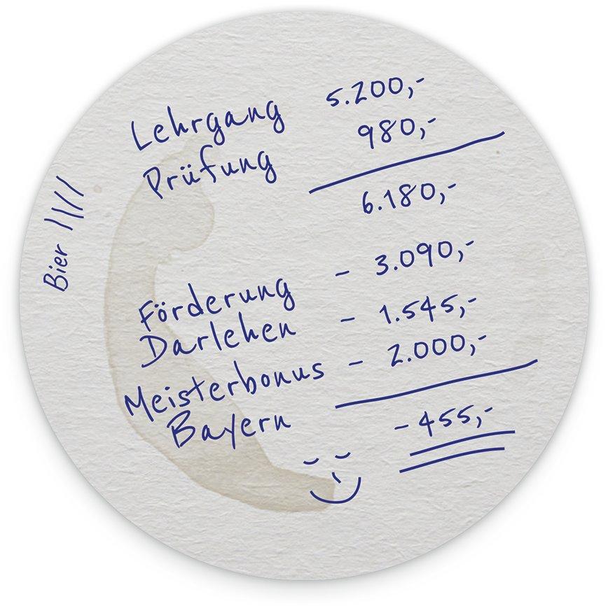 Unsere Bierdeckelrechnung sieht jetzt so aus: Der Lehrgang kostet inklusive der Prüfung 6.180 EUR. Der Bund fördert diesen Betrag über das neue Aufstiegs-BAföG jetzt zu 50 %, macht 3.090 EUR. Über die restlichen 3.090 EUR erhält der Meisteranwärter ein Darlehen. Besteht er die Meisterprüfung, werden ab sofort 50 % statt bisher 40 % dieses Darlehens erlassen, also 1.545 EUR. Und dann erhält jeder Meisterabsolvent noch vom Bayerischen Staat den Meisterbonus in Höhe von derzeit 2.000 EUR. Unterm Strich bekommt jeder Meisterabsolvent also sogar 455 EUR dafür, dass er einen angesehenen Abschluss mit Aussicht auf eine besser bezahlte Stelle macht.