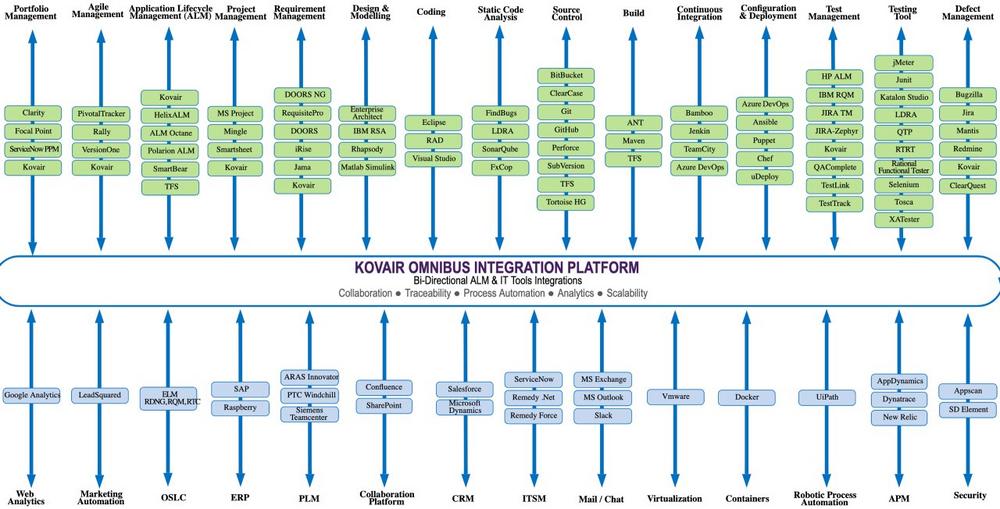 Kovair Software ist ein Unternehmen für Softwareprodukte aus dem Silicon Valley, das sich auf Lösungen für das integrierte Application Lifecycle Management (ALM) spezialisiert hat und die globale Softwareentwicklung und -verwaltung unterstützt. Kovairs Schwerpunkt auf der Integration von Best-of-Breed-ALM-Werkzeugen von Drittanbietern ermöglicht die Erstellung von Anwendungen in einer synchronisierten Werkzeugumgebung durch seine Omnibus-Integrationsplattform. Zusammen mit der Einführung von DevOps-Fähigkeiten verfügt das Unternehmen über ein umfassendes Angebot an Software-Entwicklungswerkzeugen in verschiedenen Bereichen.