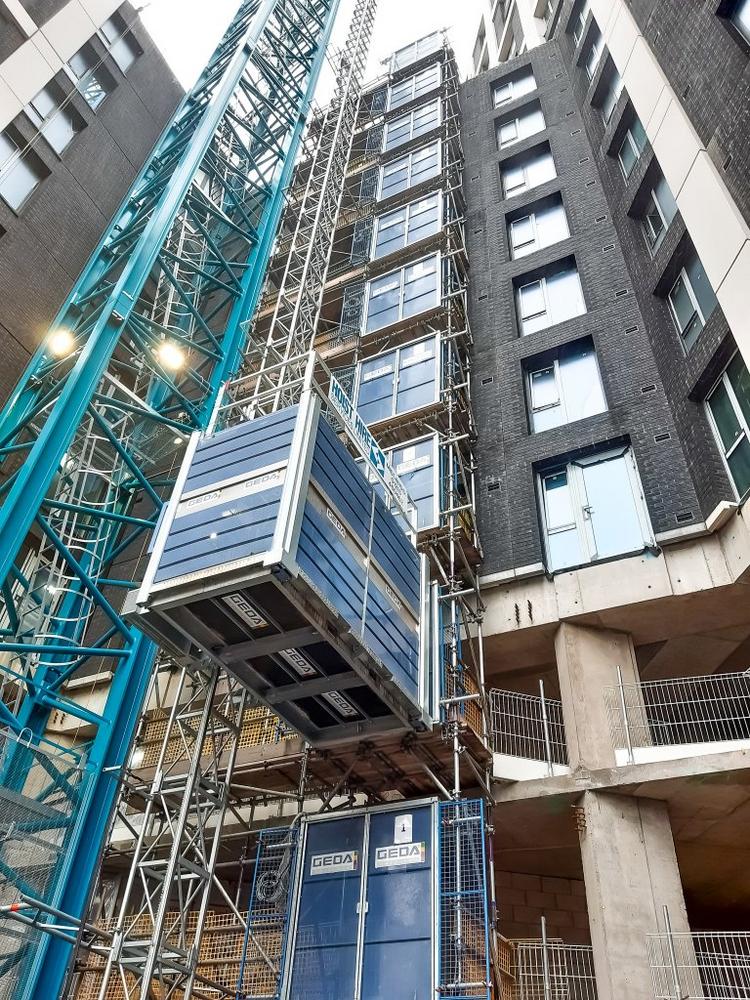 Die Bauarbeiten in der Tennant Street laufen derzeit auf Hochtouren. Um einen zügigen Baufortschritt zu gewährleisten hat sich das zuständige Bauunternehmen Colmore Tang Construction für den Einsatz von zwei Personen- und Materialaufzügen entschieden und sich damit tatkräftige Unterstützung für eine optimale Logistik am Bau beschafft. Die Aufzüge vom Typ GEDA Multilift P22 wurden über die Firma Hoist Hire Service für den Zeitraum der Bauarbeiten angemietet.
