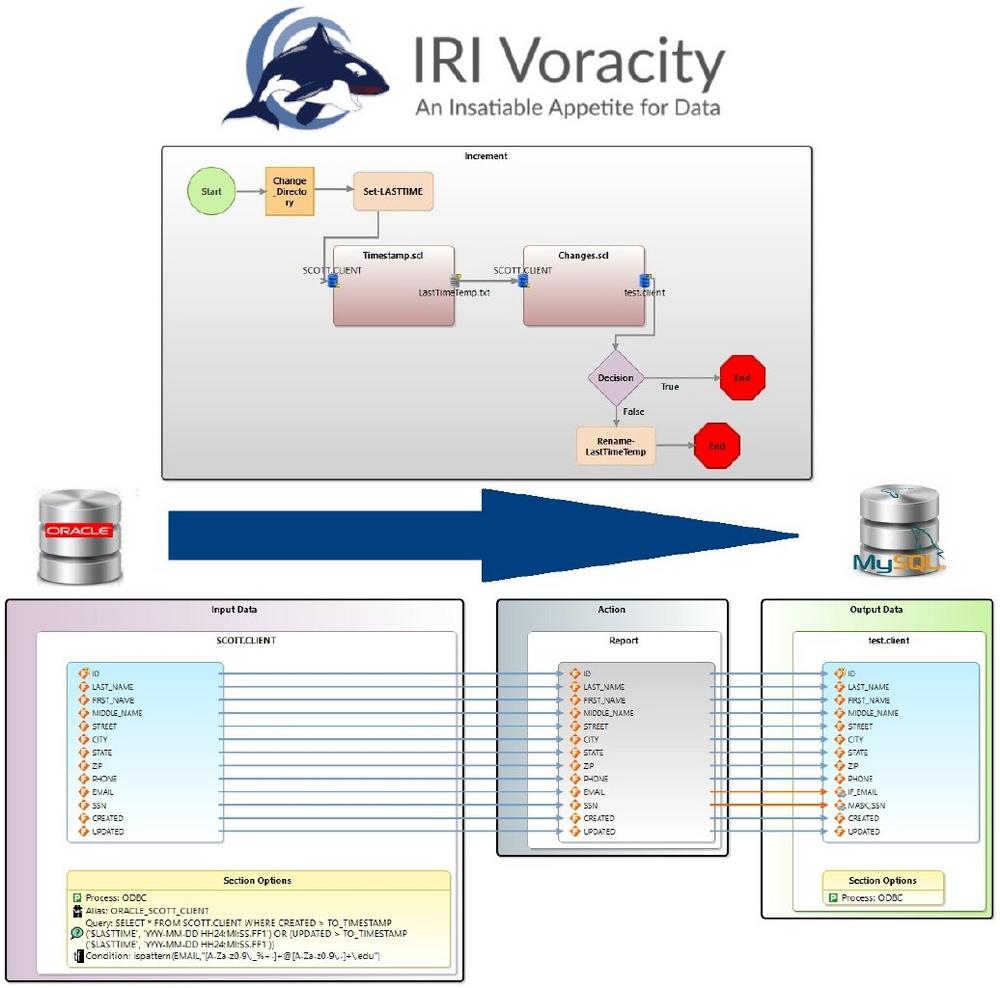 Dieser Artikel enthält ein Workflow-Beispiel, das Benutzer von Voracity, FieldShield, CoSort oder der DBMS-Edition NextForm implementieren können, um regelmäßig auf Änderungen in einer Quelltabelle (in diesem Fall Oracle) zu prüfen, um zu entscheiden, wann Daten in ein neues Ziel (MySQL) verschoben werden sollen. Es wird auch gezeigt, wie Daten als Teil dieses Prozesses bedingt maskiert werden können.