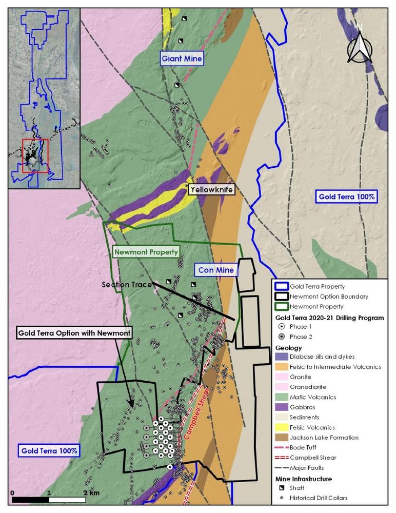 Executive Chairman Gerald Panneton stated: “The Campbell Shear target where more than 13 million ounces of Gold has been produced historically (Con and Giant mines)2 is the main reason I joined Gold Terra one year ago. Our first priority was to secure the option agreement with Newmont (Refer to news release September 8, 2020) and now the time has come to start our drilling program on the prolific Campbell Shear extension immediately south of Newmont’s Con Mine. We are very excited to begin drilling this month on what we believe to be one of the most prospective targets in the Yellowknife mining camp.”