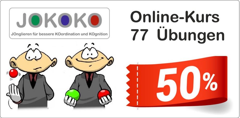 Die Übungen aus JOKOKO-Set 1-4 sind 19 einfache Übungen (Set 1), 4 mittelschwere und 3 schwere Übungen mit 1 Ball plus 11 einfache Übungen mit 2 Bällen (Set 2) sowie 20 mittelschwere (Set 3) und 20 schwere Übungen mit 2 Bällen (Set 4). Zu jeder Übung gibt es eine separate PDF-Datei mit Schritt-für-Schritt-Anleitung sowie zu jeder Übung ein Video-Tutorial, in dem alles gezeigt und erklärt wird. Aktion: Bis 31.12.2020 gibt es 50% Rabatt, d.h. man zahlt für alle 77 Übungen nur 24,32 € statt 48,64 €. Ab 1.1.2021 wird es (inkl. 19% MwSt.) wieder regulär für 49,90 € kosten.
