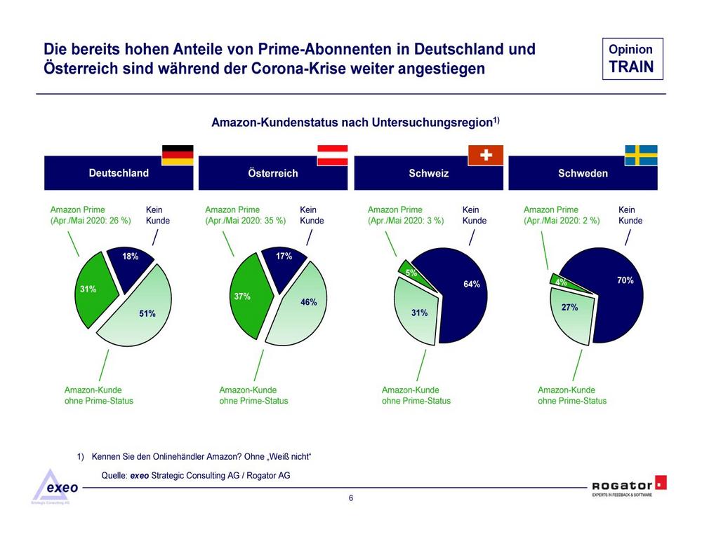 „Trotz des starken Umsatzwachstums offenbaren die Studienergebnisse eine zentrale Schwäche im Geschäftsmodell von Amazon. Die Bindung der Stammkunden an das Unternehmen ist gefährdet, selbst wenn die Zahl der Prime-Abonnenten in der Corona-Krise gewachsen ist“, resümiert Johannes Hercher, Vorstand der Rogator AG und Co-Autor der aktuellen Studie OpinionTRAIN.