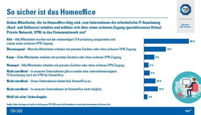 Heute, nach einem Jahr Homeoffice, scheinen viele Unternehmen ihre Hausaufgaben mit Blick auf mehr IT-Sicherheit und Schulungen erledigt zu haben. Zumindest stellen sie sich selbst gute Noten dafür aus: Laut einer repräsentativen Umfrage von TÜV SÜD geben 39 % der befragten Unternehmensentscheider an, alle Mitarbeiter im Homeoffice mit einer sicheren IT-Infrastruktur und einem VPN-Zugang (Virtual Private Network) ausgestattet zu haben. 19 % sagen, dass dies überwiegend der Fall ist, und nur manche Mitarbeiter mit privaten Geräten arbeiten oder sich ohne sicheren VPN-Zugang ins Firmennetzwerk einwählen. Nur 9 % gaben an, dass in ihrem Unternehmen immer noch viele Mitarbeiter mit privaten Geräten bzw. ohne sicheren VPN-Zugang im Homeoffice tätig sind. Immerhin 10 % der Befragten gaben an, dass ihr Unternehmen kein Homeoffice anbietet, bzw. dass im Unternehmen kein Homeoffice möglich ist (12 %).