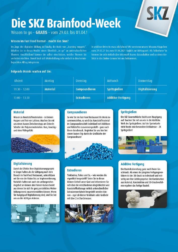 Vom 29. März bis 1. April fand die erste SKZ Brainfood Week live aus dem Online-Studio des SKZ statt. In 30-minütigen Learning Nuggets konnten Interessierte sich rund um das Thema Kunststoff informieren.