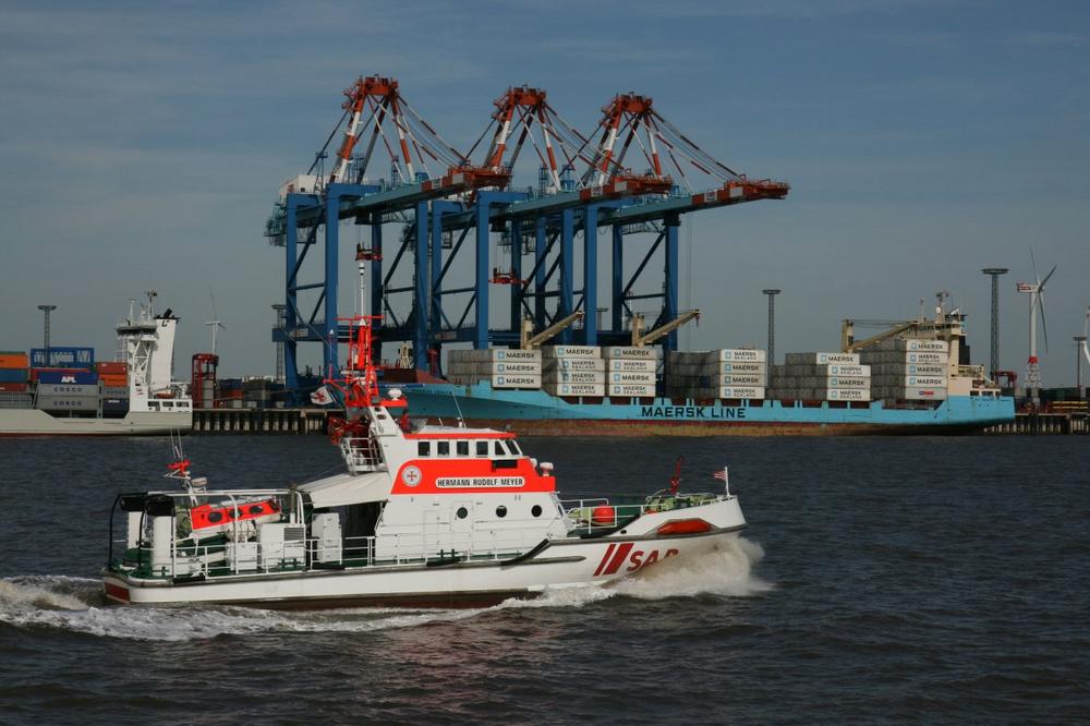 Die Verkehrszentrale Bremerhaven hatte die SEENOTLEITUNG BREMEN der DGzRS gegen 19 Uhr über einen schweren Unfall an der Stromkaje informiert. Dort hatte das unter dänischer Flagge fahrende Containerschiff „Seago Piraeus“ festgemacht. Um Treibstoff zu übergeben, lag die Bunkerbarge „Ebba 2“ längsseits des Frachters. Von diesem fiel plötzlich aus noch ungeklärter Ursache ein Gegenstand herunter. Dieser traf einen philippinischen Seemann auf der „Ebba 2“ und verletzte ihn sehr schwer am Arm. Er benötigte umgehend medizinische Hilfe. Sofort alarmierten die Wachleiter den Seenotrettungskreuzer HERMANN RUDOLF MEYER der Station Bremerhaven, da ein Abbergen* nur seeseitig möglich war. Mit einem Notarzt und zwei Rettungsassistenten an Bord liefen die Seenotretter bereits wenig später aus; Kurs: Containerterminal.