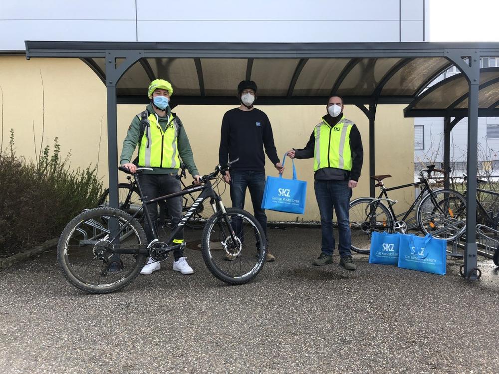 Für die Sicherheitsausrüstung sind die Radfahrer/-innen selbst verantwortlich. Das SKZ ist jedoch bemüht, seine Mitarbeiter/-innen, die mit dem Rad unterwegs sind, besonders zu schützen. Von der Abteilung Arbeitssicherheit initiiert, wurde mit Unterstützung der Geschäftsführung am SKZ nun ein kostenloses Sicherheitspaket zusammengestellt. Das Paket besteht aus einer Warnweste, einem neongelben Regenschutz für Helm und Rucksack sowie einem Schnappband für Hosenbein oder Handgelenk. 25 Sicherheitspakete im Wert von je 50 Euro wurden an die Mitarbeiter/-innen verteilt. Ziel der Kampagne ist, die Mitarbeiter/-innen im Straßenverkehr sichtbarer zu machen und so vor Unfällen zu schützen.