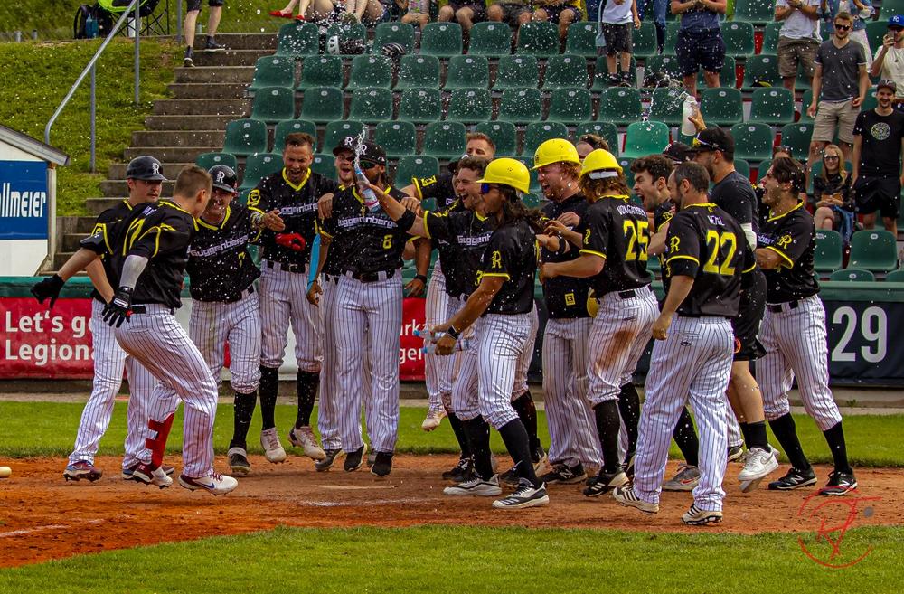 Im zweiten Spiel am Samstagnachmittag legten die Mainzer einen Auftakt nach Maß hin. Gegen Legionäre Starting Pitcher Kaleb Bowman fanden die Mainzer gleich die richtigen Mittel. Nach einem Hit-by-Pitch für Nicholas Weichert und einem Single von Peter Johannessen brachte Kevin Kotowski die Athletics mit 0:1 in Führung. Zwei weitere Hits von Victor Voll und Felix Thierolf erhöhten auf 0:3. Erst nach dem 0:4 durch Caelan Sullivan im zweiten Inning konnten sich die Legionäre offensiv zeigen. In der unteren Hälfte des zweiten Innings eröffnete Pascal Amon mit einem Solo-Homerun zum 1:4. Nach einem Double von Elias von Garßen und einem Hit-by-Pitch von Elias Redle brachte Alexander Schmidt mit seinem 2-RBI-Double die Legionäre auf 3:4 heran. Im dritten Inning sorgte Matt Vance mit einem Solo-Homerun für den 4:4 Ausgleich. Max Boldt sorgte mit einem Homerun im fünften Inning für die erneute Mainzer Führung. Doch auch die Legionäre zeigten weiterhin ihre Power und Lukas Jahn brachte sie mit einem 2-Run Homerun mit 6:5 zum ersten Mal in Führung. Mit diesem Spielstand ging es ins neunte Inning. Der eingewechselte Christian Pedrol musste nach drei Hits den 6:6 Auslgeich durch ein Sacrifice-Fly hinnehmen. Die Legionäre mussten also in der unteren Hälfte des neunten Innings erneut in den Angriff. Dieser sollte jedoch nur zwei Pitches dauern. Den zweiten Wurf von Tim Stahlmann beförderte Eric Harms zum Walkoff-Homerun über den Zaun im Leftfield und machte den 7:6 Sieg für die Legionäre perfekt.