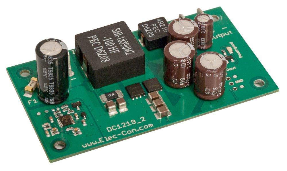 Die Boost-Wandler DC1219 und DC1224 stellen eine auf ±5 % stabilisierte Ausgangsspannung von 19 V bzw. 24 V bereit. Die maximale Ausgangsleistung beträgt 140 W bei 19 V (Maximalstrom 7,5 A) sowie 150 W bei 24 V (Maximalstrom 6 A). Gemessen mit 20 MHz Bandbreite liegt die Restwelligkeit der Ausgangsspannung unter 50 mV (Spitze-Spitze). Beide Regler sind für Versorgungsspannungen im Bereich von 10,8 bis 13,2 V (entsprechend 12 V ±10 %) spezifiziert. Nach Anlegen der Versorgungsspannung laufen die Wandler selbständig innerhalb von weniger als 100 ms an. Spannungsspitzen bis 32 V auf dem Bordnetz bleiben ohne negative Auswirkungen. Die MTBF beträgt bis zu 300.000 Stunden gemäß SN 29500. Ein Parallelschalten zur Leistungserhöhung ist optional möglich.