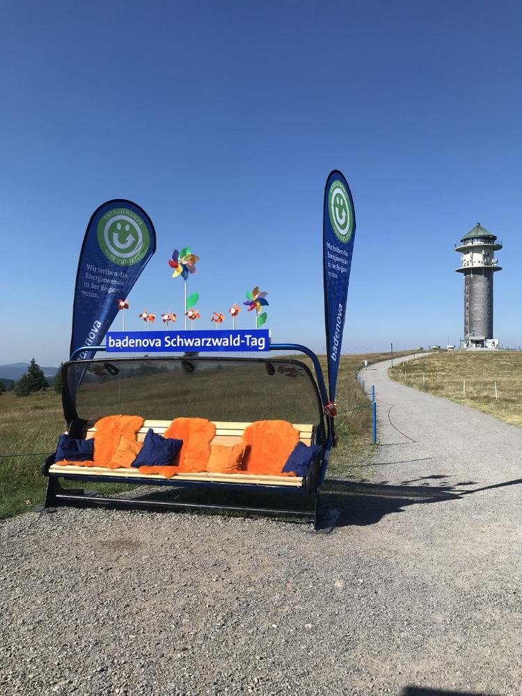 Oben angekommen erwartet die Besucher dann ein musikalisches Feuerwerk regionaler Musiker. In einem extra dort bereitgestellten Sessel mit badenova-Dekoration können sich vor dem Hintergrund des Gipfelpanoramas Besucher mit der Foto-Box fotografieren lassen und die Fotos später im Netz herunterladen. Wer den kurzen Spaziergang bis zum Feldbergturm nicht scheut, wird dort mit der Ausstellung des Fotografen Sebastian Wehrle mit dessen ganz spezifischen Blick auf den Schwarzwald und seine Kultur und Traditionen überrascht. Und auch am Turm gibt es Energie, denn dort steht die Solarbank von badenova, Baden-Württembergs höchstgelegene Solaranlage, bei der Besucher ihre Mobiltelefone aufladen und lokale Wetterdaten abfragen können. Interessierte können sich zudem vor Ort ein kostenloses Exemplar des beliebten, neuen badenova-Freizeitführers „Heimat erleben“ sichern.
