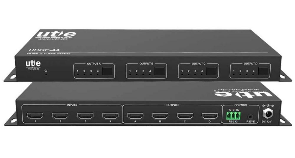 Besonders praktisch: Der Matrixschalter UHCE-44 unterstützt das Herunterskalieren von 4K auf 1080p für jeden Ausgang und gewährleistet so die Kompatibilität auch mit vorhandenen 1080p Displays oder Beamern. Das intelligente EDID Management ist vollständig mit den Spezifikationen HDMI 2.0 und HDCP 2.2 konform. Über frontseitige Tasten, sowie der mitgelieferten Infrarot Fernbedienung ist die Kreuzschiene sehr einfach zu bedienen. Die integrierte RS232-Schnittstelle ermöglicht die Anbindung an externe Mediensteuerungen. Weitergehende technische Informationen mit Preisen und Informationen zu Bezugsquellen stellt die U.T.E. auf Anfrage gerne zur Verfügung (www.ute.de).