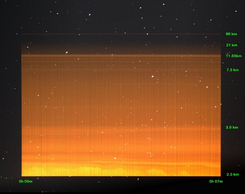 In this plot we can see the changes of the height resolved fluorescence of the various atmospheric layers of a 60W powerful narrowband 589 nm laser projected from an astronomic telescope into outer space monitored from a side view over some minutes. The thin narrow strip at 90 km is the actual fluorescence from the sodium layer that is replenished by meteoric material in a daily fashion before the sodium reacts with other atmospheric constituents and trickles down to earth.