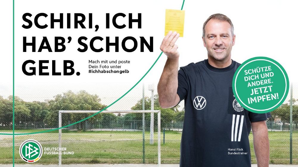 Unterstützt wird der bundesweite Aufruf, der rund um das heutige WM-Qualifikationsspiel der Nationalmannschaft gegen Liechtenstein gestartet wird, unter anderem auch von Bundestrainer Hansi Flick, Kapitän Manuel Neuer, Bundestrainerin Martina Voss-Tecklenburg sowie weiteren Nationalspielerinnen und Nationalspieler. Auch zahlreiche Amateurfußballer:innen zeigen auf den Motiven der Kampagne ihren gelben Impfpass. Ausgespielt wird „Schiri, ich hab‘ schon Gelb.“ auf Plakaten, Online-Bannern sowie auf der Bande bei den anstehenden Länderspielen der Männer- und Frauen-Nationalmannschaften. Zudem gibt es eine begleitende Social-Media-Mitmachaktion. Nicht nur Fußballer:innen sind unter dem Hashtag #ichhabschongelb dazu aufgerufen, ihren Impfpass zu zeigen und somit dafür zu werben, dass sich noch viele weitere Menschen impfen lassen.