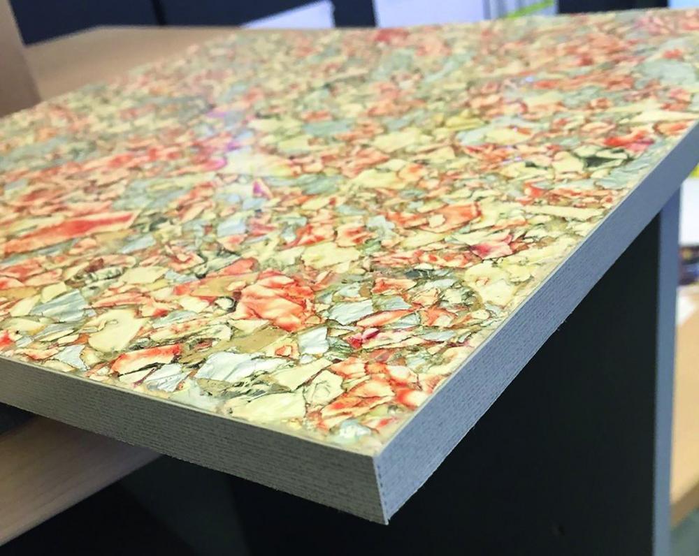 The saveBOARD process uses heat and compression to bond materials, eliminating the need for glues or other chemical additives, to produce a clean product with zero volatile organic compounds (VOCs), suitable for use in homes and commercial buildings.