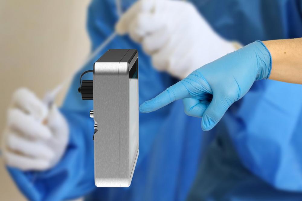 Im Corona-Testzentrum am Standort Trossingen läuft auf einem notion.H die PC-Anwendung der Testsoftware. Das Haupteingabegerät ist ein drahtloser 2D-codescanner, dessen Empfängerdongle den USB-Anschluss von notion.H nutzt. Ergänzende Bedienschritte geschehen direkt per Touchscreen. Wo nötig dient eine optimierte Bildschirmtastatur zur Eingabe von Zugangskennwörtern.