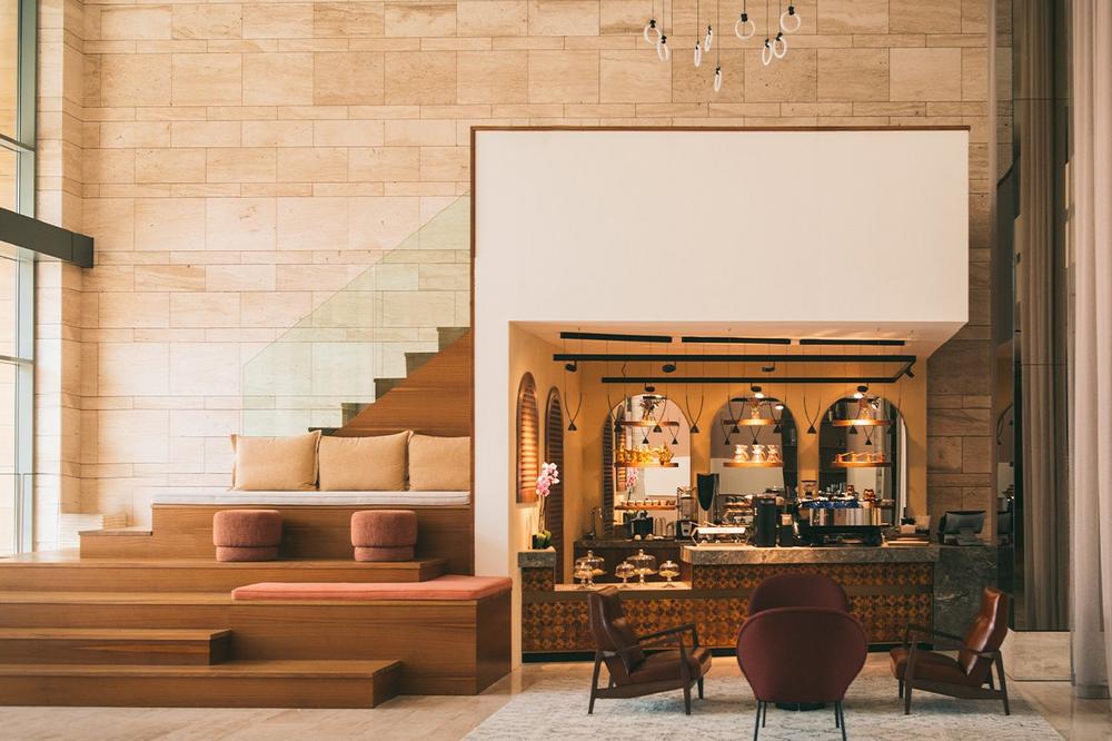 Inside The House Hotel Jeddah City Yard, David Hodkinson and Luc Lejeune of the Athens- and Saigon-based Studio Noor have overseen the interior design, with guestrooms and public spaces defined by an aesthetic born from their deep research on Saudi culture, materials, patterns, colors and crafts. Spaces are adorned with marble, bespoke furniture, and artworks made by local artists. The result is a carefully choreographed aesthetic that offers striking impressions that are both comfortable and cozy in nature, such as in the lobby, where a theatrical effect is established through a custom staircase-cum-lounge, double-height ceilings, intimate mezzanine divan seating, and a coffee nook. Additionally, the central staircase is one of many elements reflecting the fact that the property is the first in the country to integrate recent social and cultural movements: The feature is a modern reinterpretation of the traditional majlis. More than stairs, this corner also offers seating areas and it will eventually also host DJs and live music— something that just a few years ago was an unfamiliar sight inside hotels.
