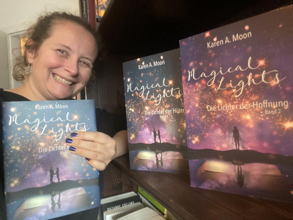 Die romantische Fantasy-Trilogie Magical Lights ist bereits mit zwei Bänden erschienen, und momentan schreibt sie am Finale dieser epischen Buchreihe. Band 1 Magical Lights: Die Lichter der Hüter erschien am 30. Juni 2021 und Band 2 Magical Lights: Die Lichter der Hoffnung am 15. November 2021. Die Romantasy-Trilogie erzählt die Geschichte der 17-jährigen Elena, die, ohne selbst davon zu wissen, einer uralten Prophezeiung nach auserwählt ist, den Untergang der magischen Welt und der Menschenwelt zu verhindern. Freundschaft, Liebe, eine große Portion Abenteuer und natürlich Magie erwarten die Leser. „Es handelt von der Kraft, nicht aufzugeben. Sich nicht unterkriegen zu lassen und sich selbst nicht zu verlieren in schweren Zeiten", erklärt Moon, die durch Corona, wie viele andere Selbstständige in Deutschland auch, von vorne anfangen musste. Ihr eigener Kampfgeist spiegelt sich in der Hauptprotagonistin wider.
