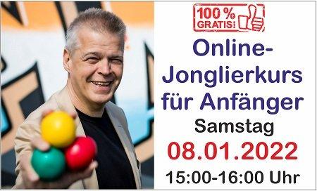 Seine ONLINE-Workshops "Jonglieren lernen für Anfänger" sind sehr begehrt. Der nächte Onlinekurs findet am Samstag. 8. Januar 2022 um 15 Uhr statt. Die Teilnahme ist kostenfrei. Hier geht’s zur ANMELDUNG
