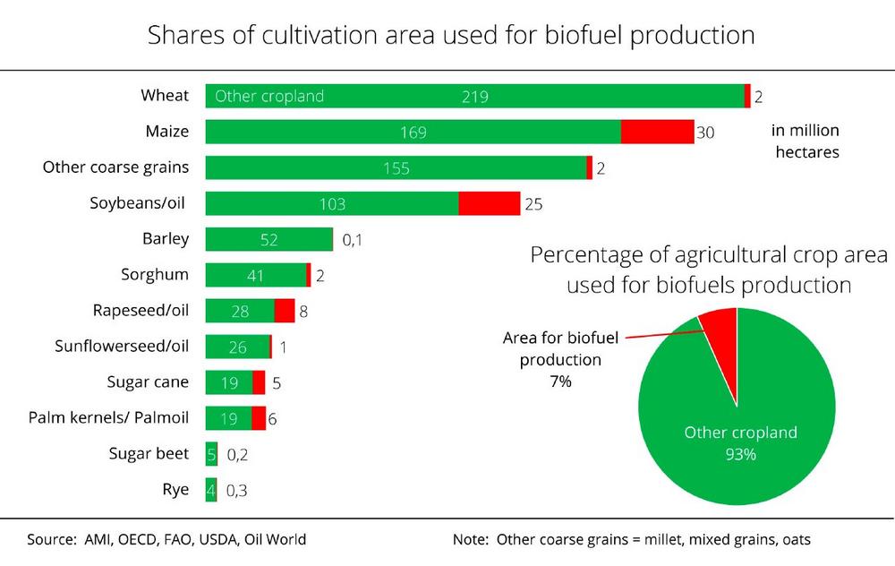 Biofuel production is mostly located in countries where there is already a surplus of feedstock (especially maize, soy and palm oil) and legally prescribed blending obligations. If the surplus were not used to produce biofuels, it would have to be placed on the global market, where it would weigh heavily on feedstock prices. The use in biofuel production reduces the production overhang, generates extra value added and reduces the need for foreign currency for imports of crude or fossil fuels. This is primarily a problem in poorer countries.