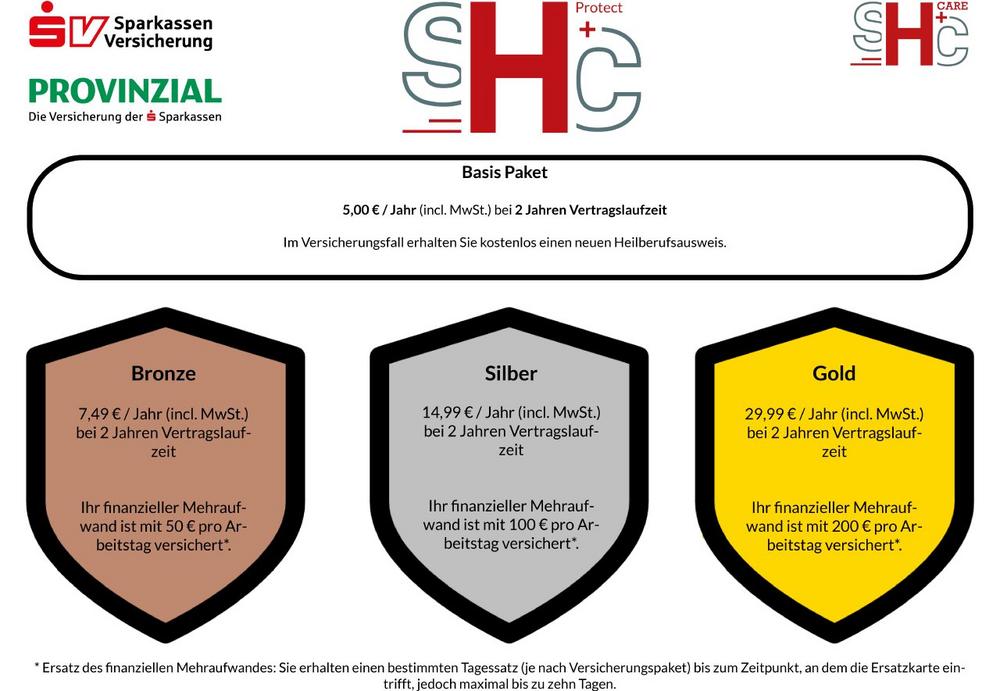 Mit SHC+Protect bietet SHC+CARE gemeinsam mit der SV Sparkassenversicherung und der Provinzial selbstzahlenden Heilberuflern den Rundumschutz für den eHBA: von der Ersatzkarte bis hin zur Entschädigung finanzieller Mehraufwände. Und das ganz individuell an die jeweiligen Bedürfnisse der Kunden angepasst. Die SV Kartenverlustversicherung gilt exklusiv nur für Kunden, die einen elektronischen Heilberufsausweis über die SHC Stolle & Heinz Consultants GmbH & Co.KG (SHC+CARE) beantragt und erhalten haben. Die Versicherungsleistung erstreckt sich vom Basis Paket, welches Verlust, Beschädigung oder Zerstörung des eHBAs absichert, bis hin zu den Optionen Bronze, Silber oder Gold, mit denen finanzielle Mehraufwendungen abgesichert sind.