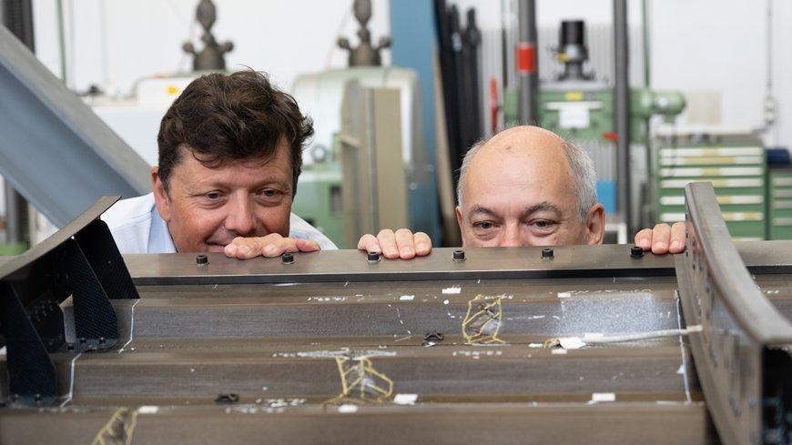 Das Konsortium erhielt den Zuschlag, und die Empa spielte dabei keine unwesentliche Rolle: Einerseits ist Hack Spezialist für die optische Überwachung von Bauteilen, für Wärmebildmessungen und für die Überwachung mittels Dehnungsmessstreifen und Bragg-Gittern. All diese Methoden sollten zugleich an den Flugzeugteilen eingesetzt werden. Und zum anderen verfügt die Empa über Maschinen, in denen die Teile eingespannt und tausende Male hintereinander gezielt durchgebogen werden konnten. Zusammen mit Silvain Michel von der Empa-Abteilung «Mechanical Systems Engineering» entwickelte Hack seine Teststrategie. Airbus lieferte aus Filton/UK das rund sieben Meter lange Flügelsegment eines Airbus A320-111, der 1988 bei einem Absturz beschädigt worden war.